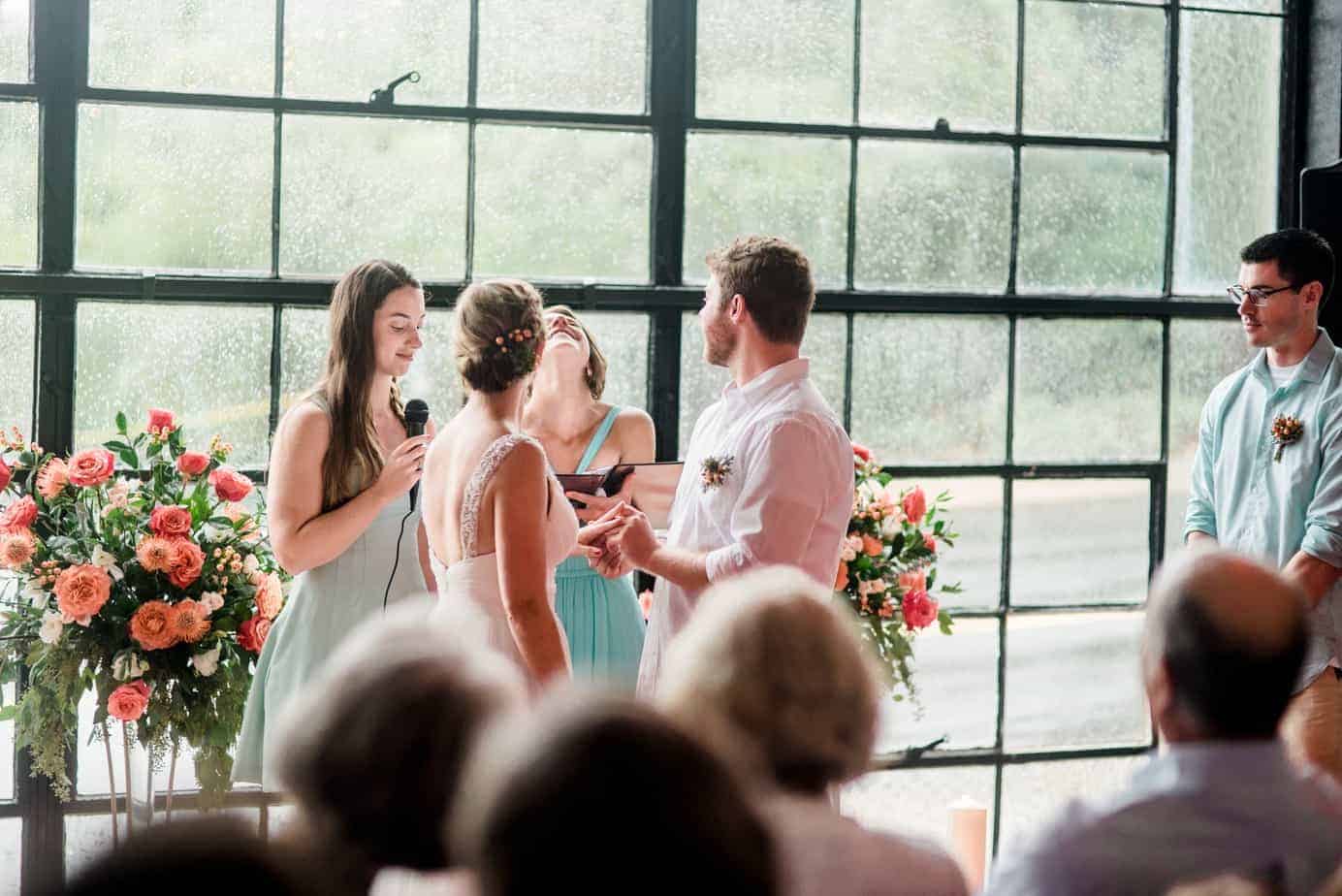 As George Harrison started crooning through the speakers, my best friend and younger sister started their trek down the aisle and my dad and I huddled together near the entrance to the men’s restroom at The Foundry. The rain came pouring down outside, but inside, it was bright and warm; the space illuminated by dozens of borrowed candles and the smiles of 90 people who had completely dropped everything to help us put together a wedding in three days.