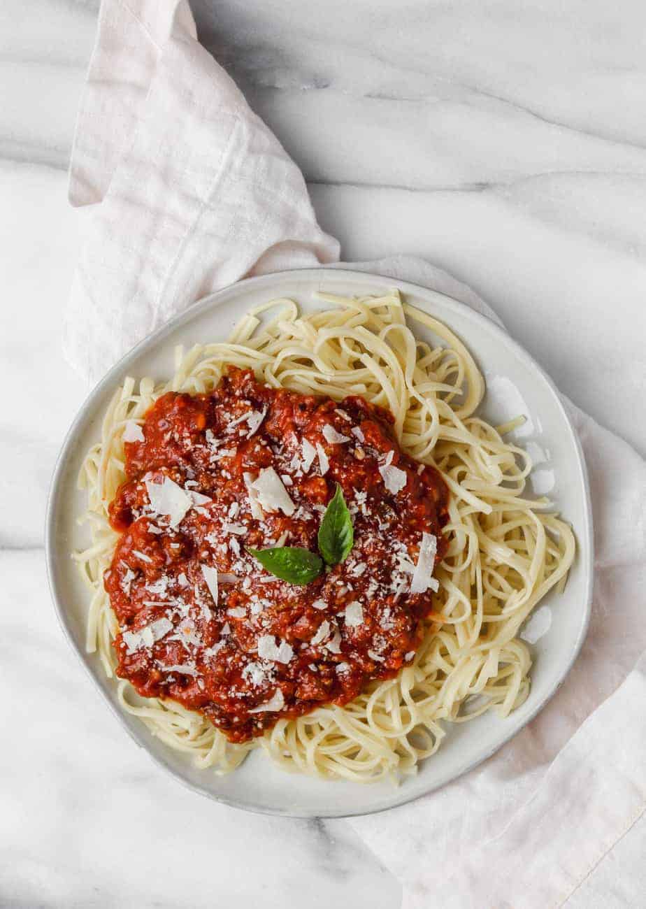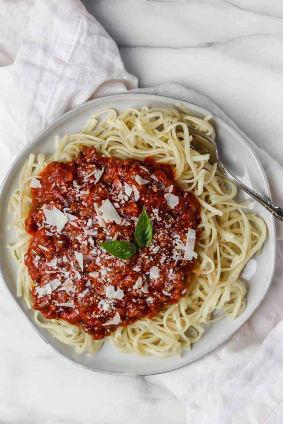 My grandmother’s easy homemade spaghetti sauce is a comforting classic that takes just a few minutes of prep before simmering away on the stove. This family favorite recipe is not only delicious but versatile and can be used to top pasta, lasagna, pizza, spaghetti squash, zucchini noodles and more!